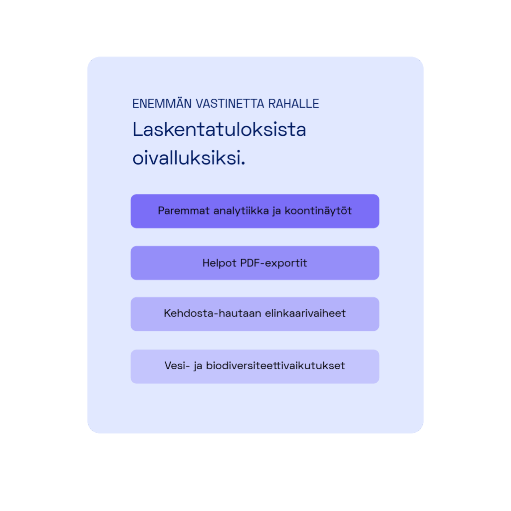 - Yhtenäinen ilme ja käyttökokemus eri laskentatyökalujen välillä, jotta tuotekohtaisten ja yritystason laskentojen käyttö tuntuu saumattomalta.
