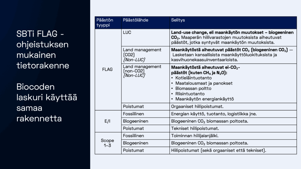 Alla oleva taulukko havainnollistaa FLAG-, E/I- ja Scope-päästöjen eroja. Biocoden laskuri hyödyntää samaa tietorakennetta ja jakaa päästöt taulukon mukaisesti, jotta raportointi vastaa GHG-protokollan asettamia vaatimuksia.